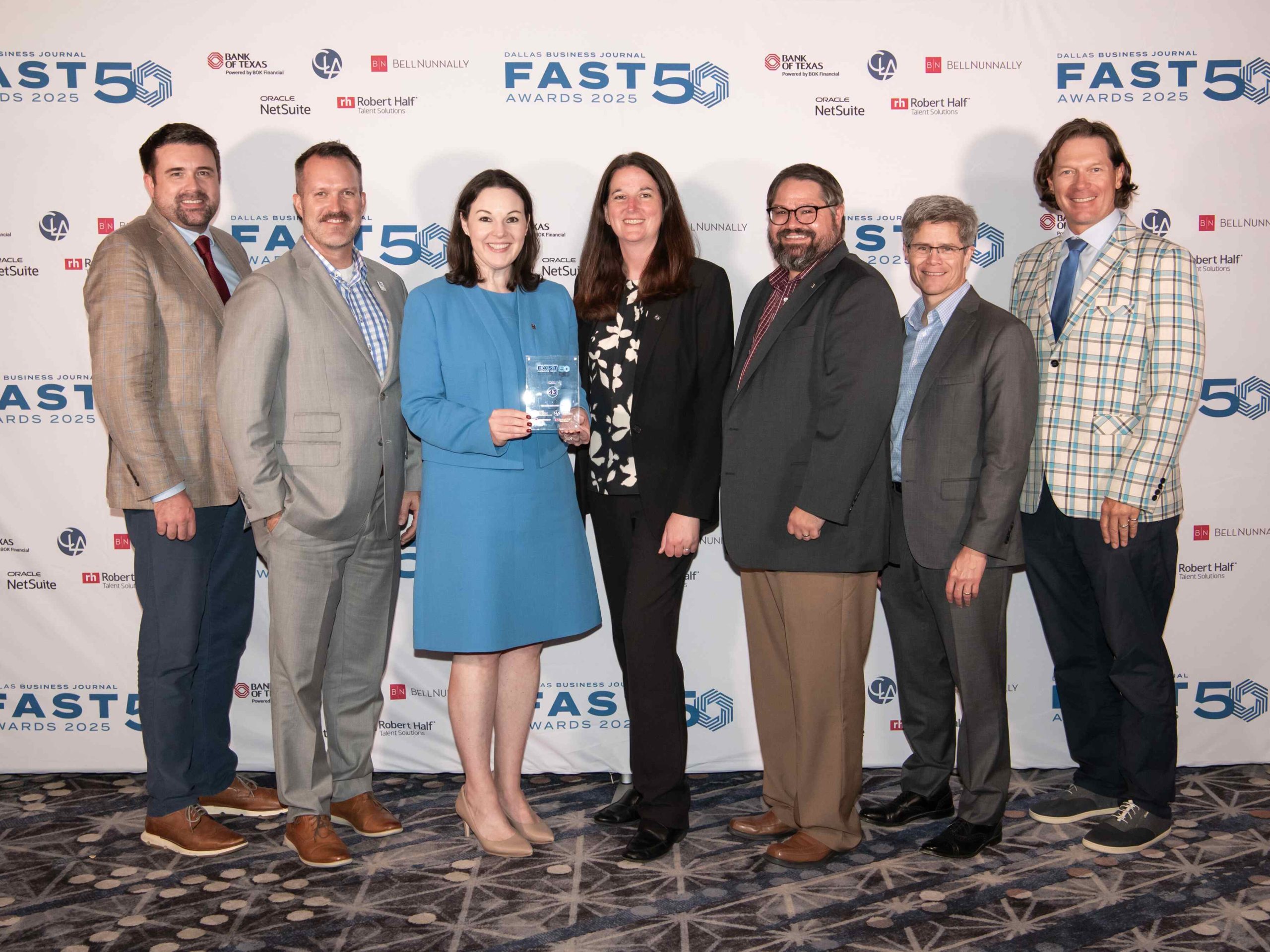 From left to right: Halff’s Dallas Operations Manager Ryan Delmotte, Frisco Operations Manager Ryan Smith, President and CEO Jessica Baker Daily, Senior Vice President Leigh Hollis, Richardson Operations Manager Jarred Overbey, Richardson Deputy Operations Manager Todd Woodson and North Texas Market Leader Brian LaFoy pose for a photo at the Fast 50 Awards event.